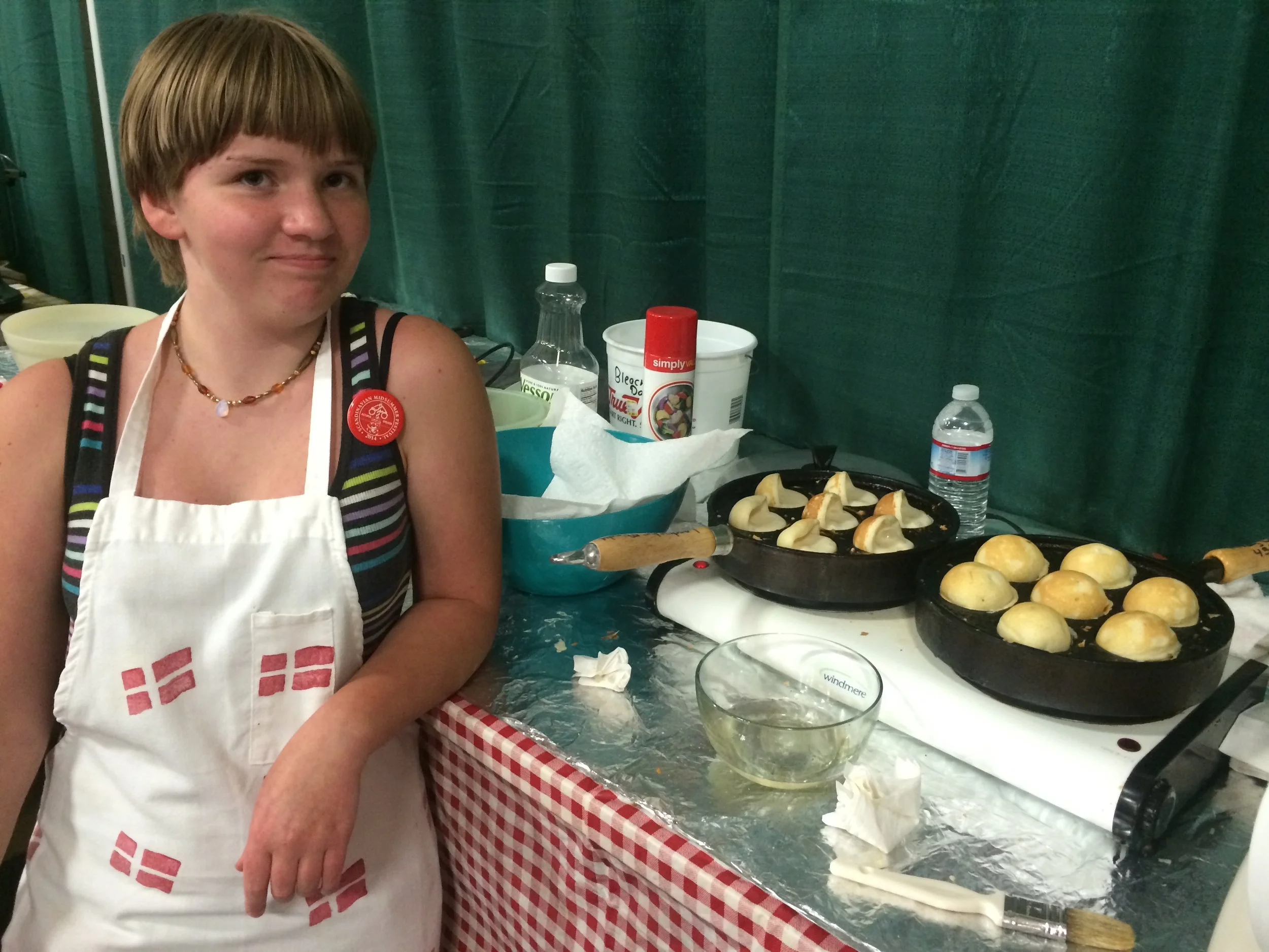Preparing traditional aebleskiver for the Danish Booth at Midsummer Festival - a home-made local favorite!